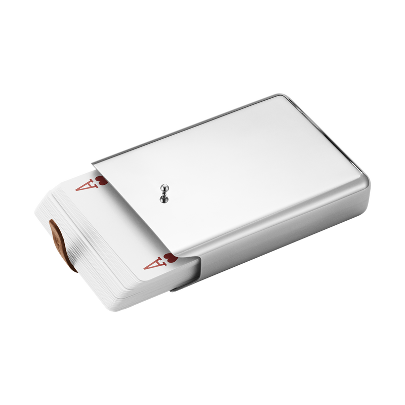 The card case is expertly crafted from stainless steel with a mirror-polished finish and a leather fastening. It contains 52 playing cards with two jokers.